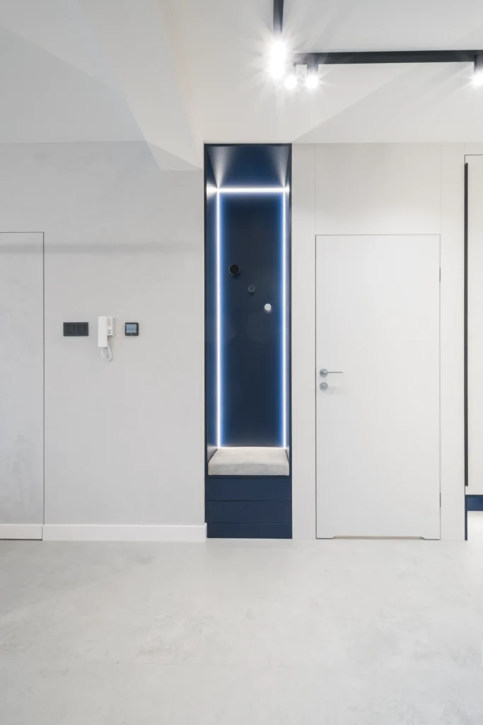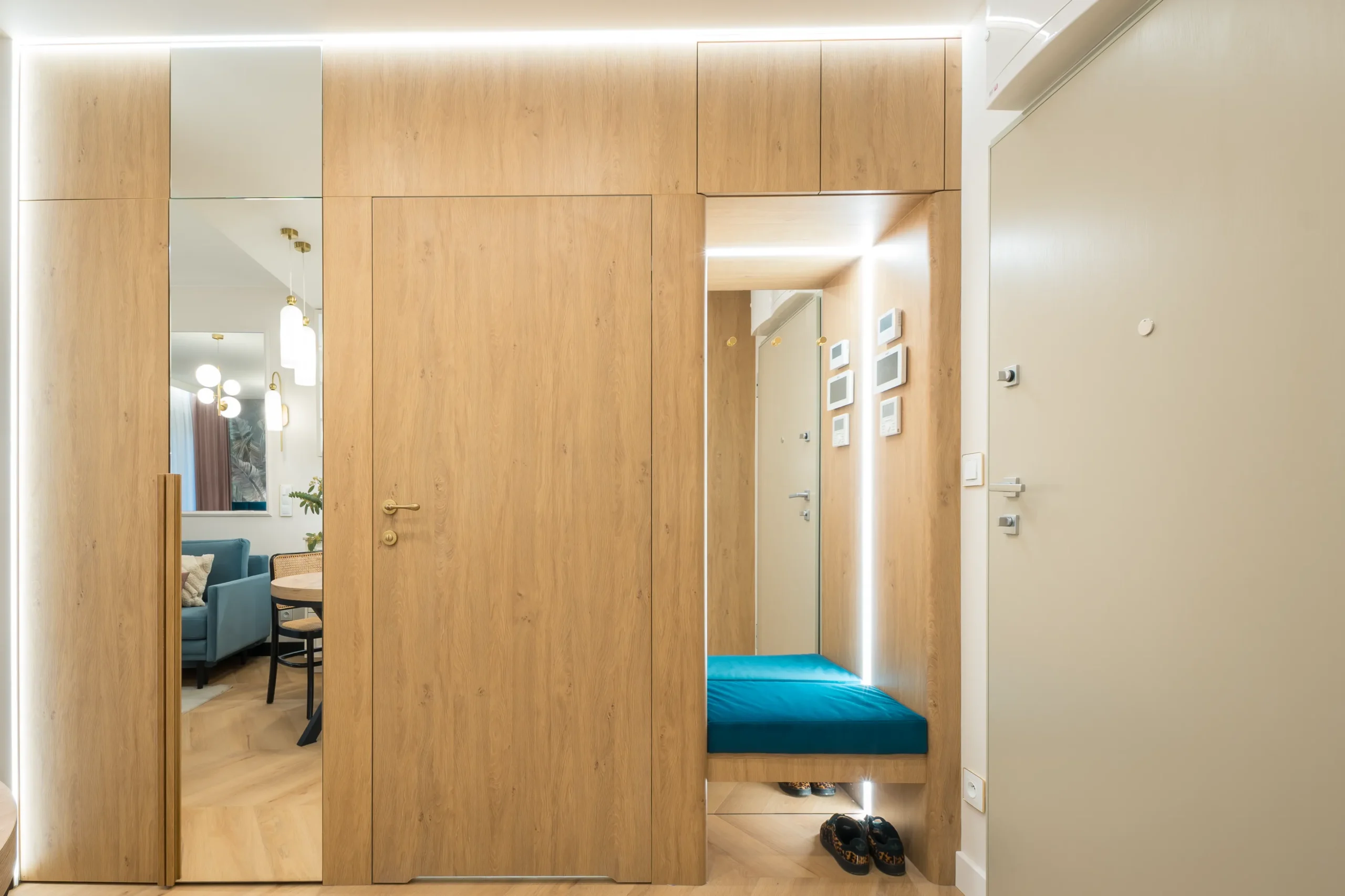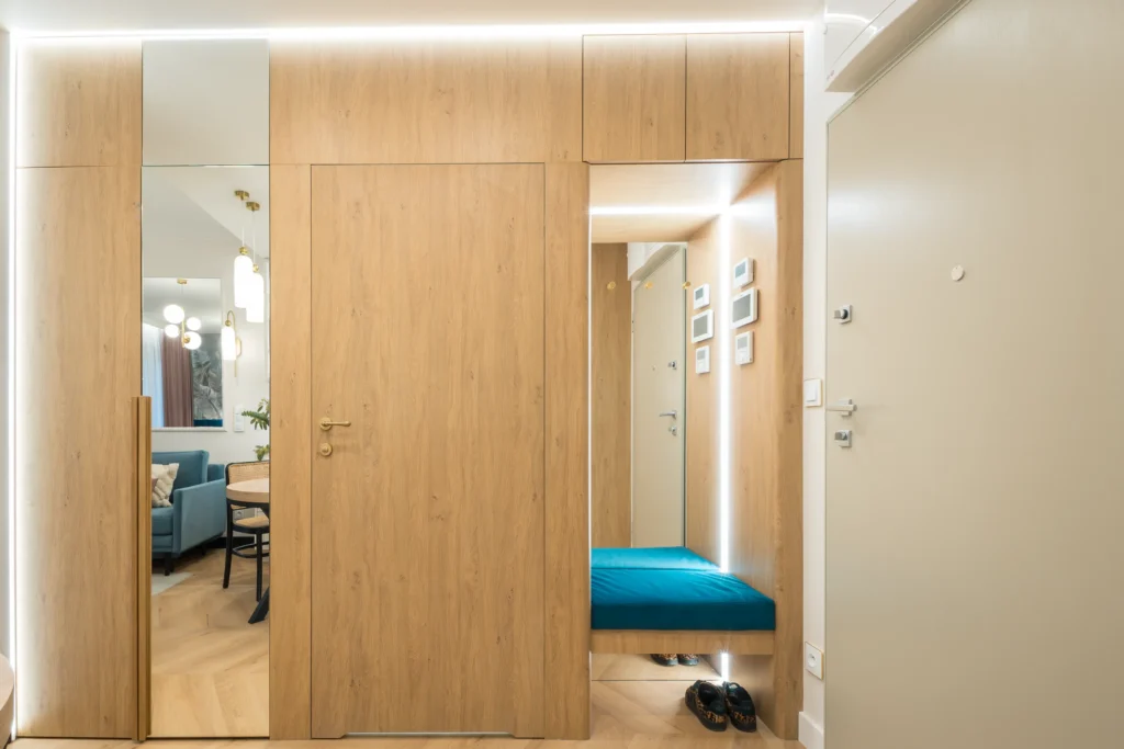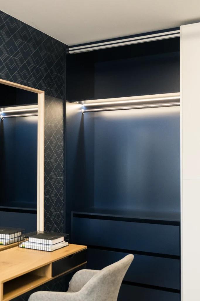 - Zabudowa szafy i ukryte wejście do łazienki. Płyta Dąb Kamienny 5527 SN